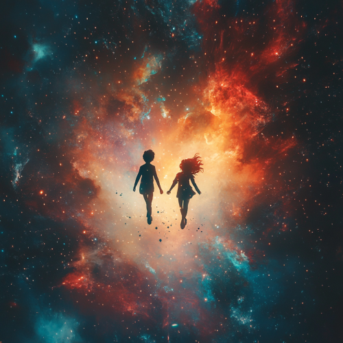 a romantic cosmic scene showing a boy and a girl walking in the vastness of space. They are both floating in space. Their figures should be surrounded by a soft, ethereal glow. The background should be a deep space scene with twinkling stars and a subtle nebula. Add small particles of light that float around them like cosmic fireflies, emphasizing the magical nature of their connection. The overall composition should capture both the physical attraction of gravity and the emotional magnetism between them, creating a sense of destiny and cosmic love. Mike Mignola style