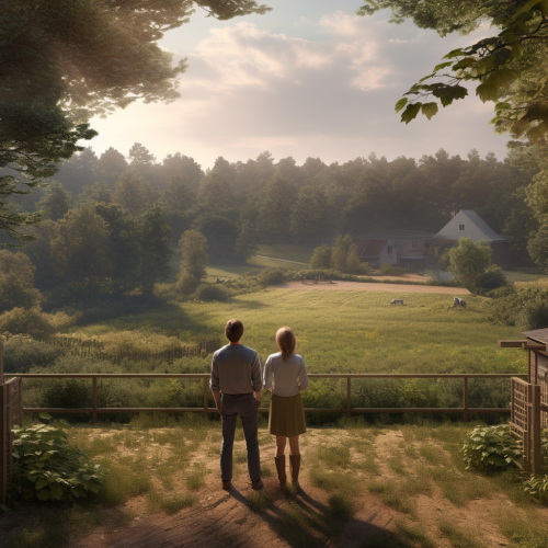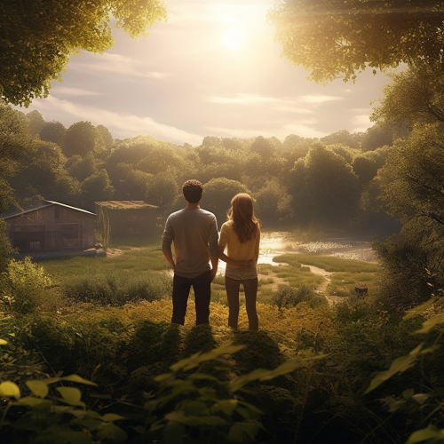 Create a photorealistic scene of a couple standing together, looking at an empty plot of land surrounded by lush nature. The area appears untouched, with signs that construction is about to begin. The couple, viewed from behind, is facing towards the open space, contemplating their future. The atmosphere is calm but filled with potential, with warm sunlight filtering through the trees, casting a hopeful glow on the scene. Make the colors soft and earthy, evoking feelings of anticipation, possibility, and connection to nature. ar 16:9 --v 5.1 --s 750 --style raw