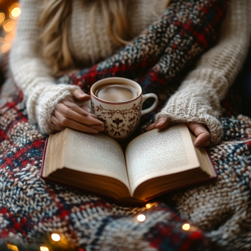 A close-up photo of a cozy winter scene with a couple’s hands holding a warm mug and an open book, viewed from above. The couple is wrapped in a thick, festive plaid blanket with red, white, and blue colors, creating a comforting, intimate atmosphere. Soft Christmas lights and a gentle fire glow in the background. Emphasize the textures of the blanket and the warmth of the scene, capturing the quiet, relaxing moment without showing faces or identifying features --style raw --s 750