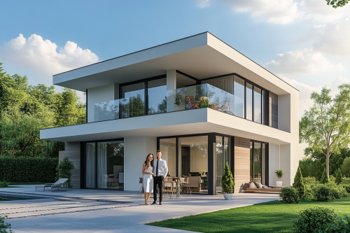 Photorealistic image of a young Japanese couple posing in front of a newly constructed, clean and modern home, both wearing semi-formal outfits, sleek facade and well-kept exterior of the house visible, representing an elegant new beginning. Realistic photo, 8K resolution --ar 3:2 --v 6.1 --style raw