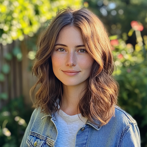 A realistic profile photo of a woman named Emma Lewis, 30 years old, with shoulder-length wavy brown hair. She has a relaxed and friendly expression, wearing a light denim jacket over a casual t-shirt. Emma is standing in her small garden, with green plants and flowers in the background. The scene is naturally lit with warm sunlight, reflecting her love for nature and eco-friendly living