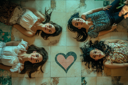 5 women lay on a large kitchen floor that has a giant heart print on the tiles, they lay on their sides with their heads touching in a star shape --ar 3:2