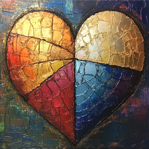 a heart that is divided into four quarters; the first quarter is cracked; the second quarter is a mended; the third quarter is shiny; the fourth quarter is full of love.
