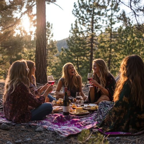 A group of friends enjoying an outdoor picnic, laughing and toasting with stemless wineglasses on the edge of a pine forest at sunset. They are sitting around colorful, bohemian-style blankets, surrounded by trees, with a bottle of red wine and a cheese platter in front of them, capturing their joyous moment against the backdrop of nature's beauty. This high-resolution photograph, taken using a Canon EOS R8 camera on a sunny day with natural light and a wide-angle lens, showcases intricate details and sharp focus, resulting in a highly realistic image.