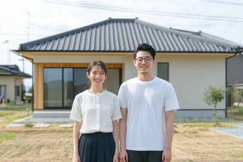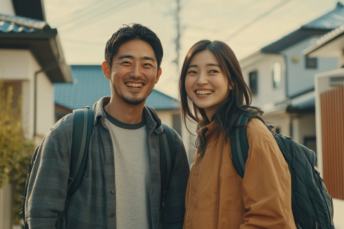 Photorealistic shot of a young Japanese couple standing in front of their new single-family house, both smiling with joy, dressed casually, modern house design in the background, capturing the feeling of new beginnings. Realistic photo, 8K resolution --ar 3:2 --v 6.1 --style raw