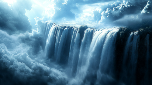From heaven above out of the clouds pouring out like a small waterfall different forms wealth, riches, love, abundance, cinematic, dynamic, --ar 16:9 --v 6.1