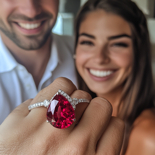 a pear shape shiny RED ruby engagement ring with diamond trillion accents in 18k white gold - a photograph of a man and woman - he just gave her the ring - she is wearing it - they are both smiling and looking very in love