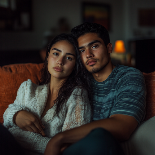 A Latina woman sitting next to her boyfriend on a sofa at home, looking extremely serious and contemplative. Her boyfriend is visibly cheerful and happy, creating a striking contrast between their expressions. They are close together, emphasizing their relationship dynamics. The cozy living room setting is warm and inviting, with soft lighting and comfortable furnishings, highlighting the emotional tension between the couple.