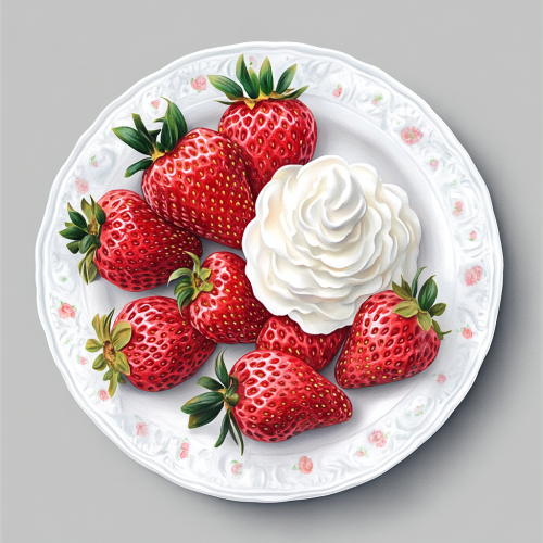 highly detailed watercolor clipart of multiple strawberries and whipped cream next to them, on a beautiful porcelain white plate, valentine's day, luxury aesthetic, beautiful illustration with realistic details, high resolution, gray background