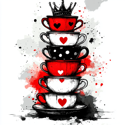 a stack of teacups with a crown around it. Trash polka design. Semi realistic. Illustrative. Black, red and white colour scheme. Teacups should have heart decor --s 250