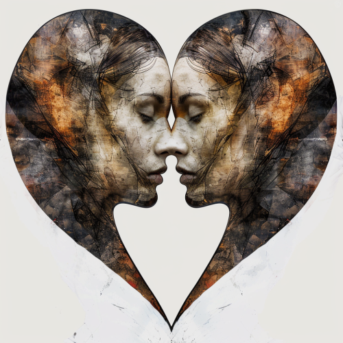 symmetrical image of avant garde art style heart with two faces approaching an embrace within the heart. Contrast image sharply on solid white background. --v 6.0