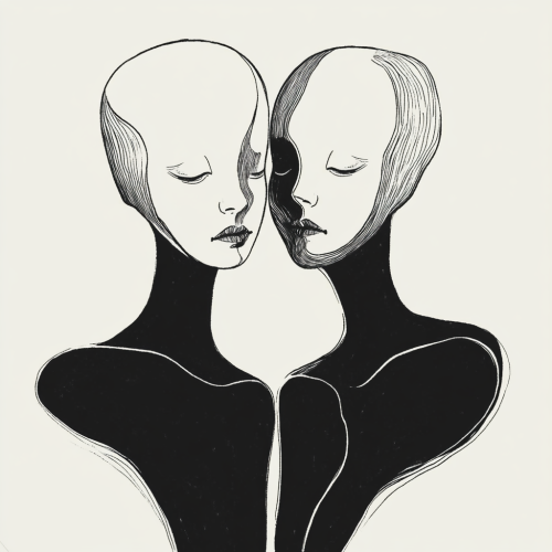 Draw two minimalistic, faceless outlines, with only the curves of their shoulders, necks, and a slight suggestion of their faces leaning toward each other. Leave a thin space or gap between them, emphasizing the sense of absence or distance.