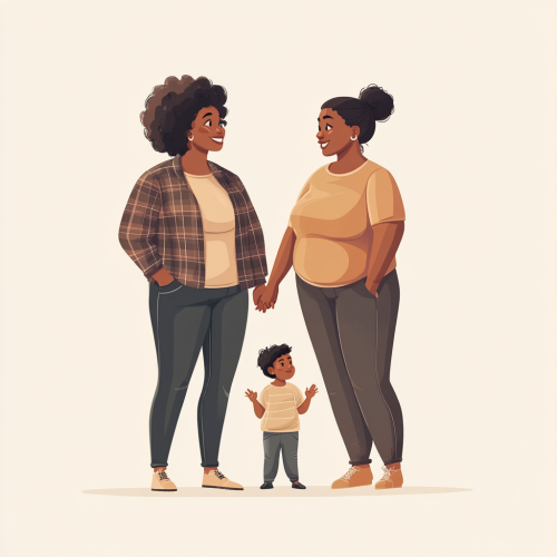 fat black lesbians womans standing, smiling, looking to the side and talking. holding hands with a child in the other side. with casual and simple clothes. Full body image, high quality image and neutral background