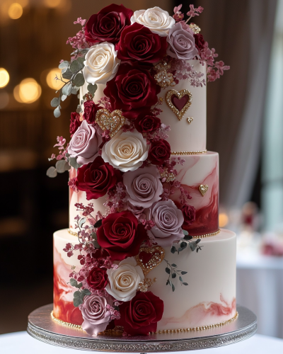 Create a tall multi layered cylinder cake Geode design with a Valentine's day celebration theme. The base has fondant with a marbleized design using red and hot pink and lavender and bright white and shiny Gold colors. Gold Royal icing fancy filigree and paisley and swirl designs. Create a cascade of Small Roses in red and white and pink and lavender with small flowers and ivy vines in the very top layer. In the bottom of the cake is a beautiful cluster of roses and small flowers and ivy that extends to the sides and around the base of the cake. Add jeweled Large heart brooches. Rhinestones and gems. Green ivy vines. This cake sits on a beautiful silver cake stand on a dessert table with layers of satin ruffle tablecloth. The background has curtains and there are spotlights on the cake. --ar 4:5 --v 6.1 --stylize 500