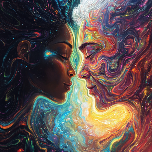 two people , a dark black skinned woman and a very white skinned man, staring into each other's eyes and sharing telepathy with a gentle pattern of colorful energy waves flowing between them. They are both happy and focused staring directly into each others eyes.