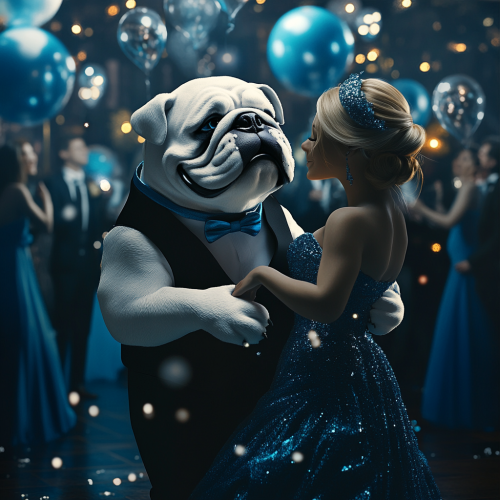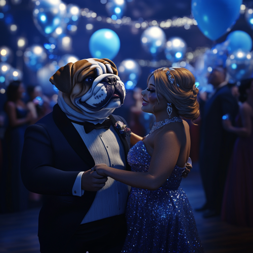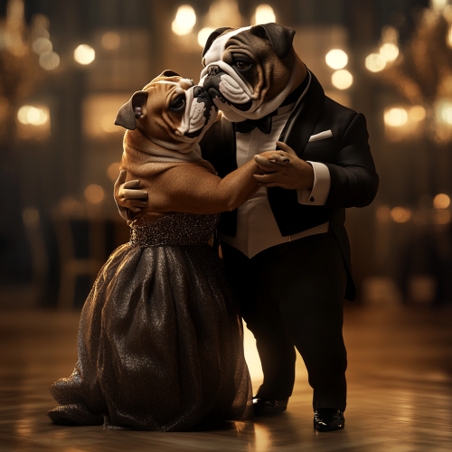 A finely dressed bulldog slow dances with his femal bulldog on the dancefloor of prom, style photorealistic, beautiful lighting, shallow depth of field