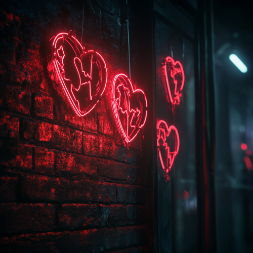 dark wall where neon signs of broken broken hearts are hanging, with dark red neon kisses, front view, dark environment, neon environment, realistic, high resolution, real details, fine textures front view, 8k, cinematic, color grading, real photo, Taken with a Canon AE-1 using 12mm Kodachrome film. In the style of Philip-Lorca diCorcia's photography. --v 6.1