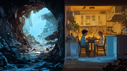 A dynamic scene showing the dramatic transformation from a dark, foreboding abyss on the left to a warm, comforting family scene on the right. The left side is filled with shadows, jagged rocks, and an overwhelming sense of despair, while the right side contrasts with a cozy kitchen bathed in warm, golden light where a family sits together, sharing a meal with smiles and love. The central axis serves as the turning point, seamlessly blending the two sides and highlighting the stark contrast between darkness and light, despair and hope. --ar 16:9