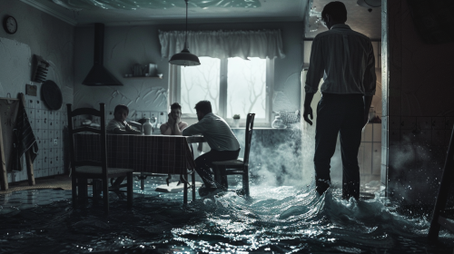 a man on the edge of a clean dark abyss to nowhere, behind him is a kitchen with his family sitting at the table waiting for him, life, love, cinematic, dynamic, --ar 16:9 --v 6.0