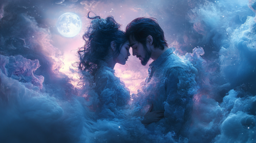 photo illustration from a world in the clouds, in the style of tanya shatseva, a couple embracing with an asian female and middle eastern male, dark indigo and light cyan, mind-bending sculptures, realistic hyper-detail, fluid simplicity --ar 16:9 --stylize 750 --v 6.1