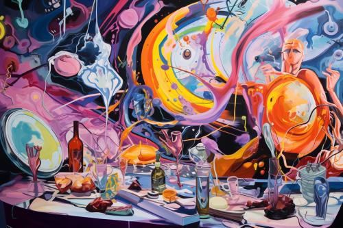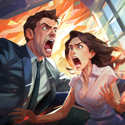 Hyperrealistic painting depicting two female angels in an embrace, symbolizing love and support. The first angel has large black wings and a flowing red gown, representing passion, while the second angel has dark gray wings and a black gown, representing despair. They are surrounded by abstract representations of various sins, such as greed, envy, and pride, each depicted through symbolic objects or scenes. The background is filled with intricate patterns and abstract shapes representing the complexity of human emotions and the interconnectedness of sins. The painting should have intense lighting, saturated colors, and bold brush strokes to enhance the visual impact of the image.