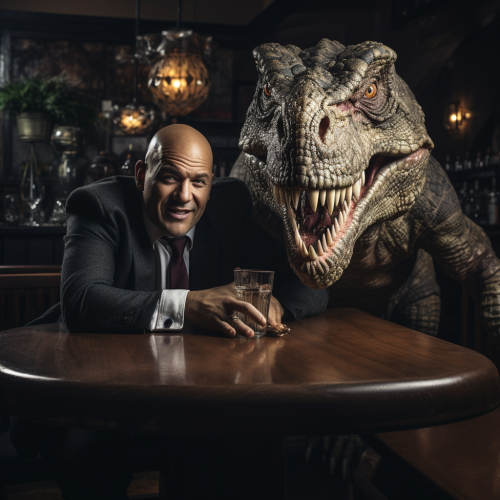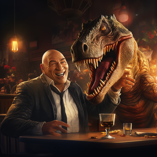 a bald head man sitting in a bar black dressed and looking into camera, he is drinking wine and stroking the head of a tyrannosaurus rex dinosaur with his hand, he is sitting beside the tyrannosaurus rex dinosaur, they love each other --style raw --s 250