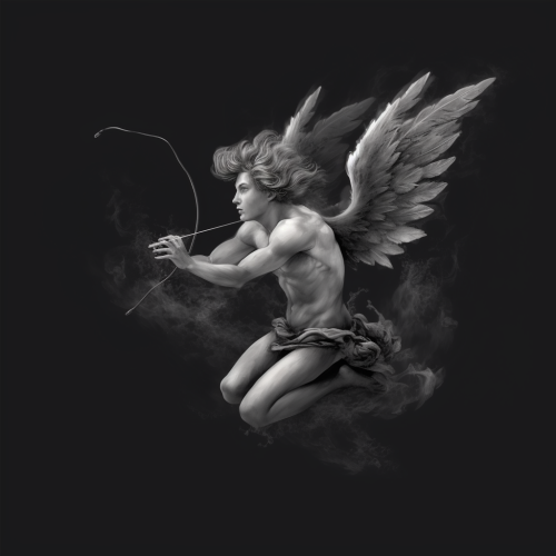 Realistic sketch drawing of cupido and culture. Shooting at a heart. Flying. Black and white only. Ultra realistic. Smokey environment. Black background. --v 5.0