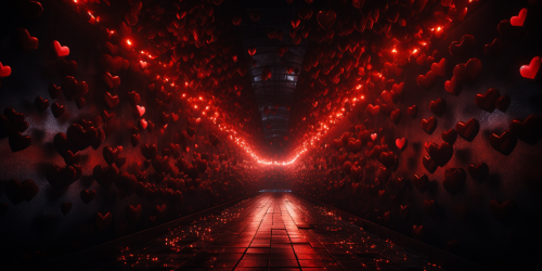 dark tunnel filled with floating bright red love hearts beautiful cinematic photography --ar 2:1