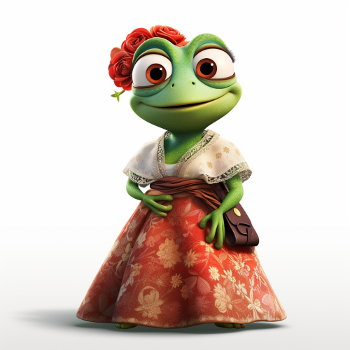 Create a woman female character named Doña Cuca accompanied by an ugly frog pet in a pixar or Disney style with the following personality: Hurt, Resentful, Lacking in love, Doesn't know how to show or receive love , Superiority complex, Angry, Punishing, Double personality, perhaps bipolar, only pretends to be pleasant, Only cares about money and the appearances, thinks with money and gifts love and care can be replaced, perfectionist, demanding.