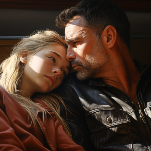 father and daughter, daughter is 14 year old, dad is sad, fayther and daughter are looking at each other, photo realistic
