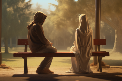 Two costumed figures in love, one resembling a classical hero and the other in a sidekick outfit, sitting on a park bench in conversation, illustrating the partnership aspect of the savior complex in relationships, photorealistic, 400 dpi, 4k, --ar 3:2