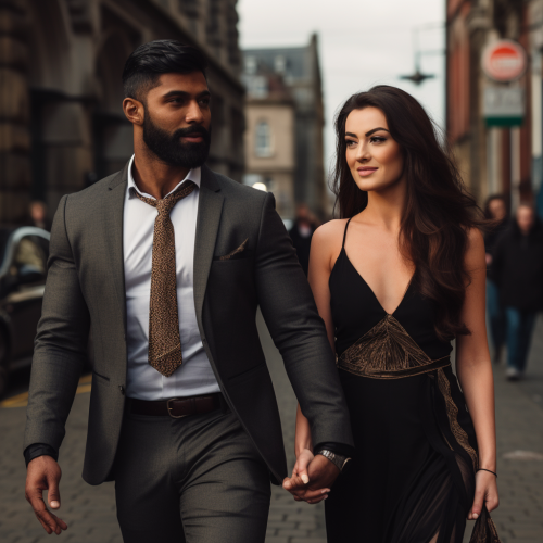 Irish looking woman with long black hair and handsome Sri Lankan man, both well dressed, holding hands on a date