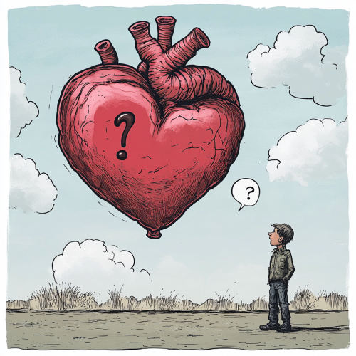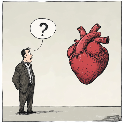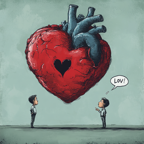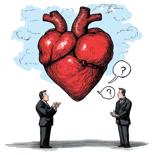 a cartoon of a conversation between a bureaucrat and an over-sized anatomically correct human heart. Their communications is shown in word-balloons. The bureaucrat speaks a word balloon containing a heart symbol for LOVE. The Human heart speaks a word balloon containing a question mark.