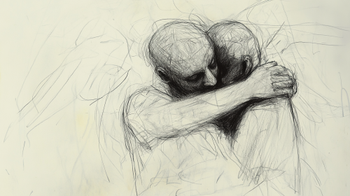 A rough, chaotic pencil sketch depicting a figure embracing a loved one. The lines are jagged and uneven, adding a sense of unease to the otherwise tender moment. The figures are close, their forms intertwined, but there's a subtle, eerie quality to the scene, as if something unsettling lies beneath the surface. The background is minimal, with rough, abstract lines creating an atmosphere that feels both intimate and slightly off, capturing the complexity of love with a hint of darkness. The sketch is intentionally rough and abstract, maintaining a balance between tenderness and unease. --c 8 --ar 16:9 --v 6.1