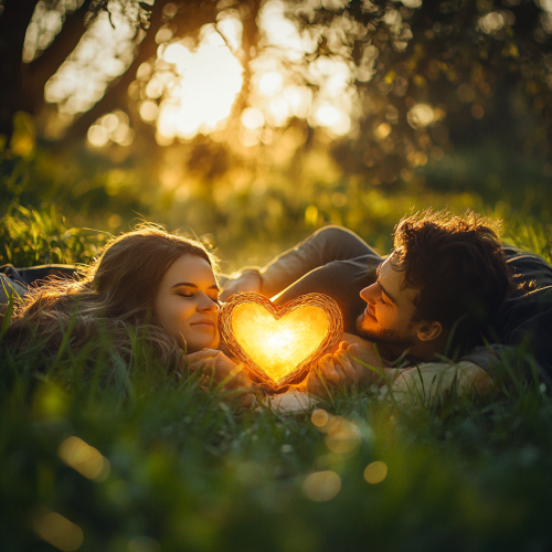 "Create a warm and heartfelt scene of an plus-sized African American couple lying together on a grassy field during a peaceful afternoon. They are holding a glowing, golden heart-shaped object between them, symbolizing their love and connection. The couple has relaxed and content expressions, enjoying the serenity of the moment. Their clothing is casual and comfortable, with the soft sunlight filtering through the trees, adding a gentle warmth to the scene. Surround them with soft shadows, subtle highlights, and a tranquil environment to enhance the emotional depth and intimacy of the scene." Realistic cartoon