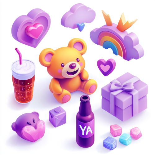 Cute 3d emojis, isometric view, lip, Rainbow on the clouds, a teddy bear holding a heart, two glasses of beer, a bottle of soda and three ice cubes surrounding it, a heart above the heart gesture, and a small lightning bolt near the YA gesture, render in the style of vector illustration,the main color is trendy purple, highlighting each icon, designed in a style that is suitable for use on social media platforms, such as Instagram or live broadcast room gift style, on a white background— stylize 200