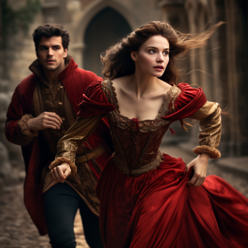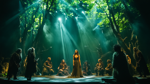 a musical scene on stage. the stage desing is a forest. there is a beautiful woman with brown hair. we see more skin of her. she is not an elf. she is singing to a elvish prince with dark curly hair --ar 16:9