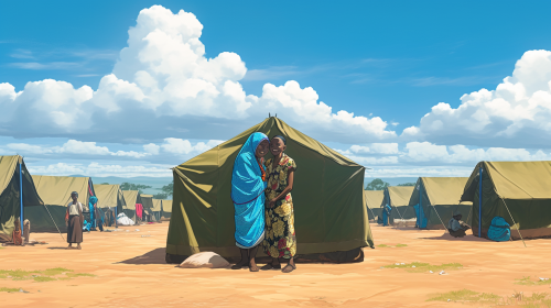 a loving Sudanese family stands in front of their tent in a South Sudanese refugee camp, they are smiling, high-definition, anime-style, --ar 16:9 --niji 6