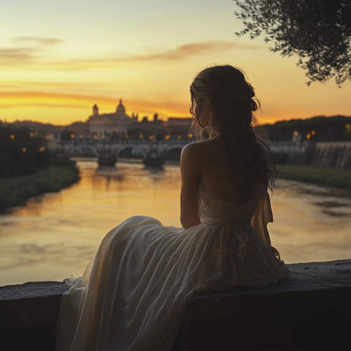 Livia Valeria, alone by the Tiber River at sunset, where she once met Lucius. Her dress flows elegantly as she gazes at the horizon, reflecting on the love she lost. The city of Rome is visible in the distance, bathed in the soft glow of twilight. hyperrealistic, cinematic, 8k