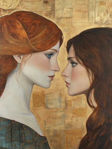 A painting of an attractive female couple in the style of Jean-Léon Gérôme and Fernand Khnopff, depicting a red-haired woman with blue eyes and pale skin looking lovingly at a brown-haired woman in front of her looking at the viewer. The painting features gold leaf accents. --ar 3:4
