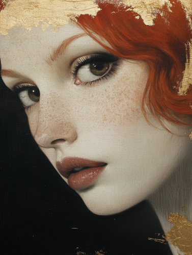 A painting of an woman the style of Jean-Léon Gérôme and Fernand Khnopff, depicting a red-haired woman with dark eyes and pale skin looking lovingly at the viewer. the painting features gold leaf accents. --ar 3:4