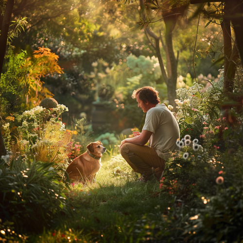 Create an ultra-realistic photograph of a person crouching next to their dog in a lush garden. The person should appear as a warm and caring guardian, with gentle eye contact and a loving smile. The dog is calm and content, possibly sitting or lying down, with the sun casting a soft, natural light over the scene. The garden should be filled with vibrant greenery, blooming flowers, and a well-maintained lawn, enhancing the peaceful and joyful atmosphere of the moment. --s 50 --v 6.0