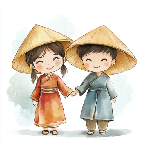 a cute boy and a girl holding hands, wearing vietnamese traditional clothes and vietnamese traditional hat, smiling, color, vector file, watercolor, white background, ar 9:16