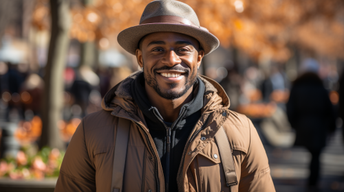 A young, confident African diaspora lover of life spending a warm sunny day walking through Central Park, smiling with assurance exudes success, reliability, and competence. --ar 16:9 --style raw --s 750