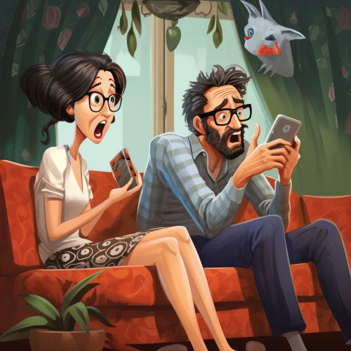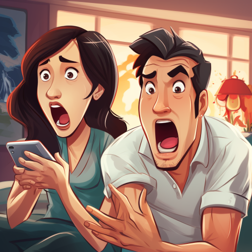 cartoon caricature couple at home when man look into mobile phone and she is very affraid