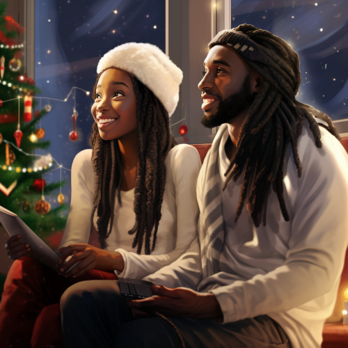 3d black man with dreads with his beautiful black wife watching Christmas movies on a flat screen