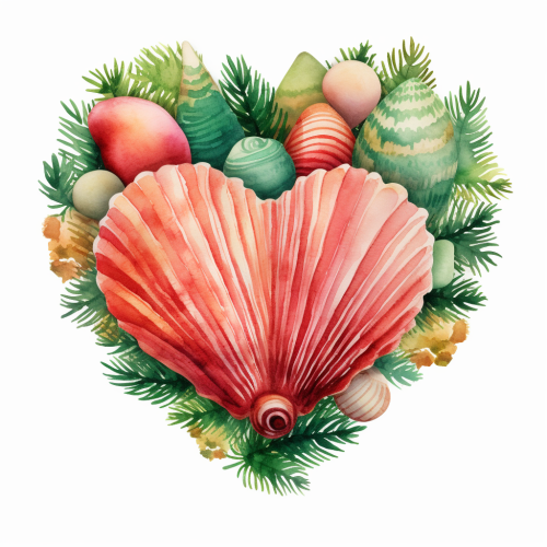 beautiful watercolor illustration of Christmas color red and green seashells in the shape of a heart, detailed, digital art; style, beautiful, adorable, surreal