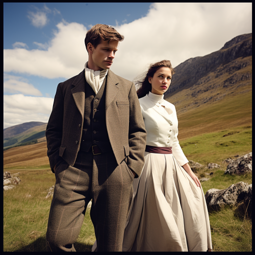 photorealistic fashion shoot, in the Scottish Highlands covered with heather in bright daylight, full-length shot of a couple stand inches apart but not touching; he gazes intensely at her; she’s a 21st century bride in a white wedding gown, brown hair; he's a strikingly, ruggedly handsome man, early thirties, from 1746 Scotland wearing a kilt; faces well-lit, expressions are serious, rich color palette, high contrast.