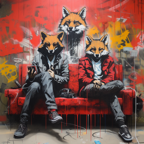 /couple chilling on sofa, both have mobile phones in the hand, background a red graffiti with a symbol “ no mobile phones”, banksy style