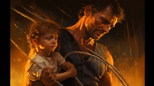 a father loves his son and punishes with cane whip, warm heart, intricate detail, artgerm, --ar 16:9